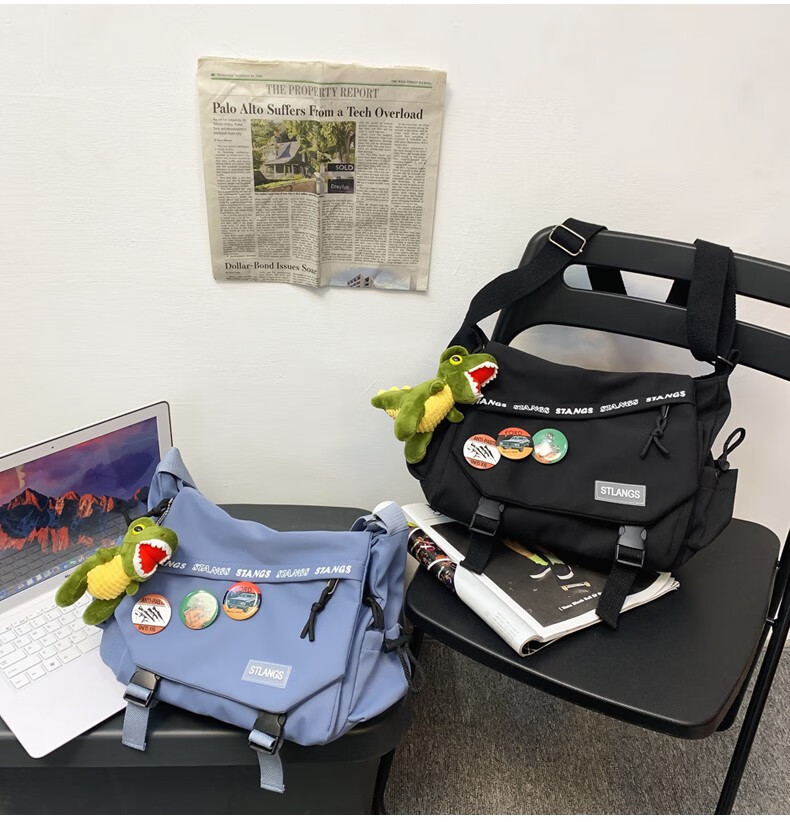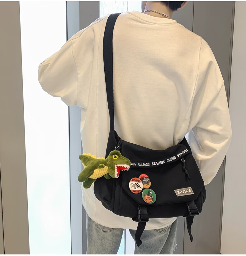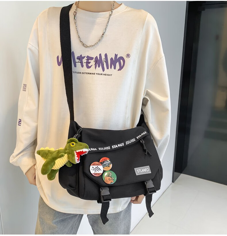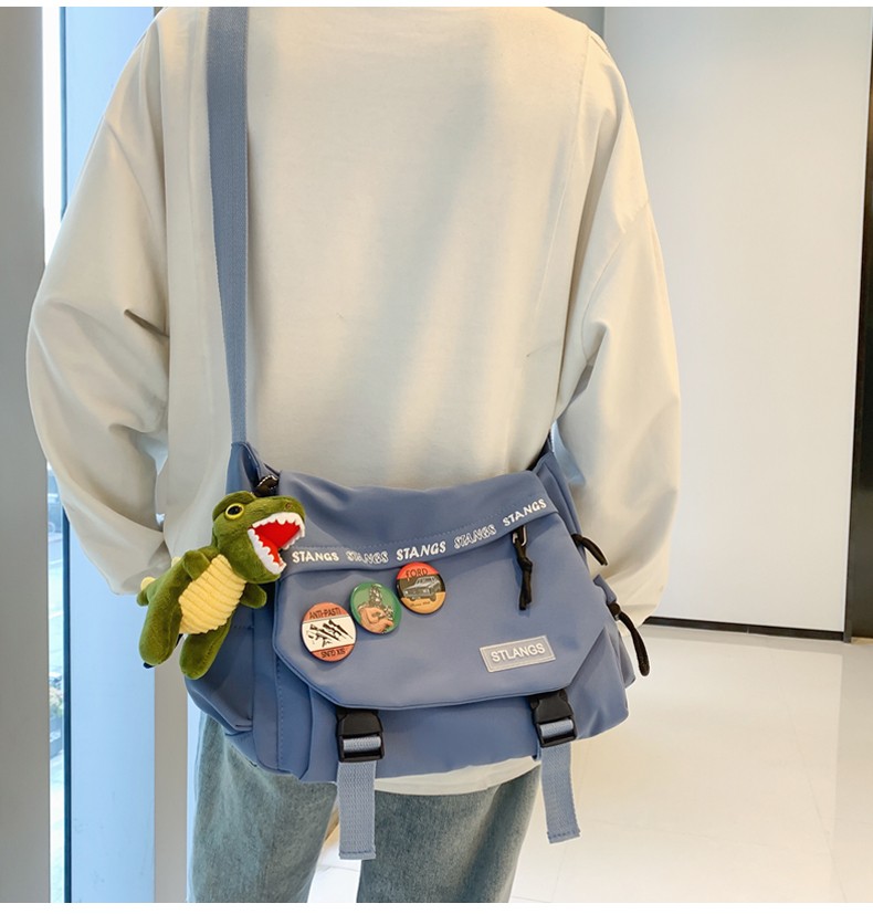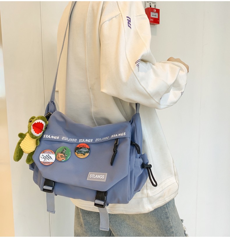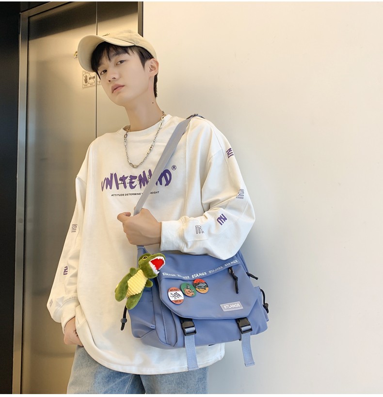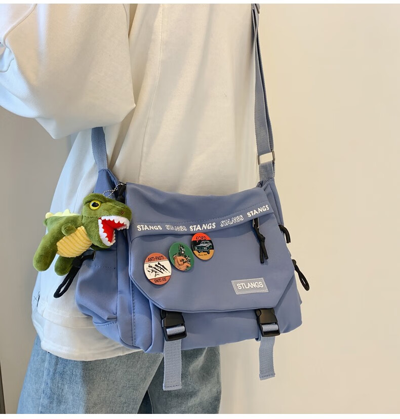 北慕 斜挎包男士潮牌学生休闲百搭潮大容量ins男生背包女邮差包单肩包 蓝色【红嘴恐龙+3个徽章】