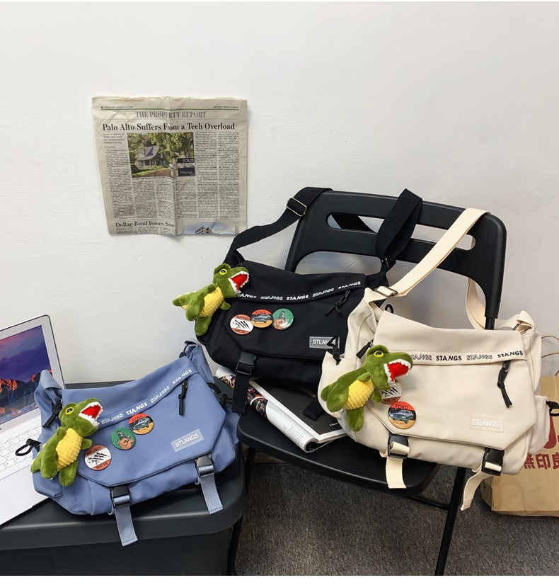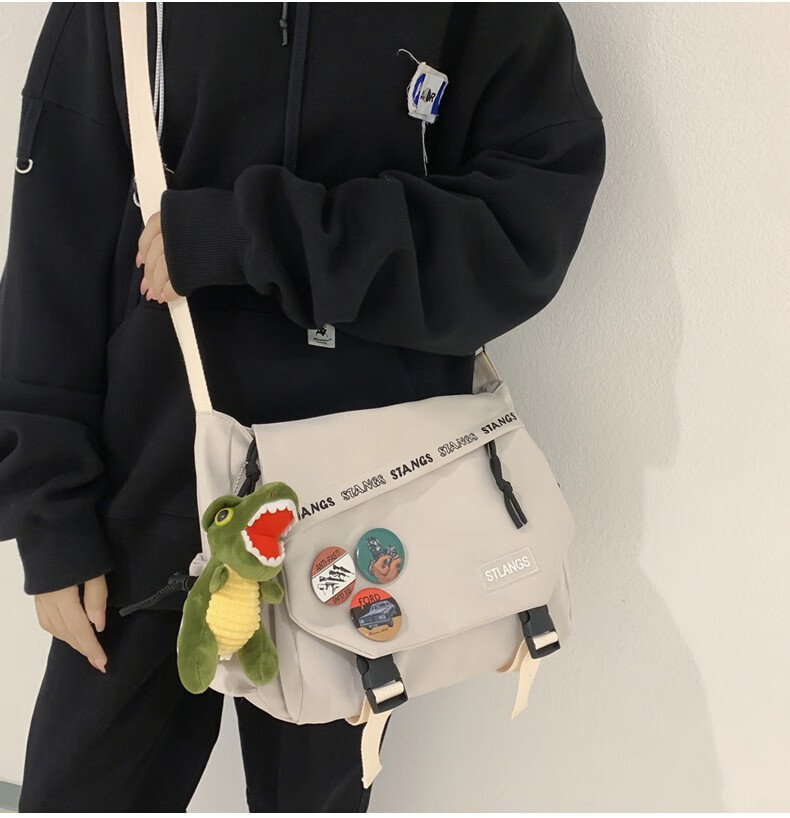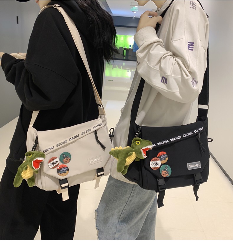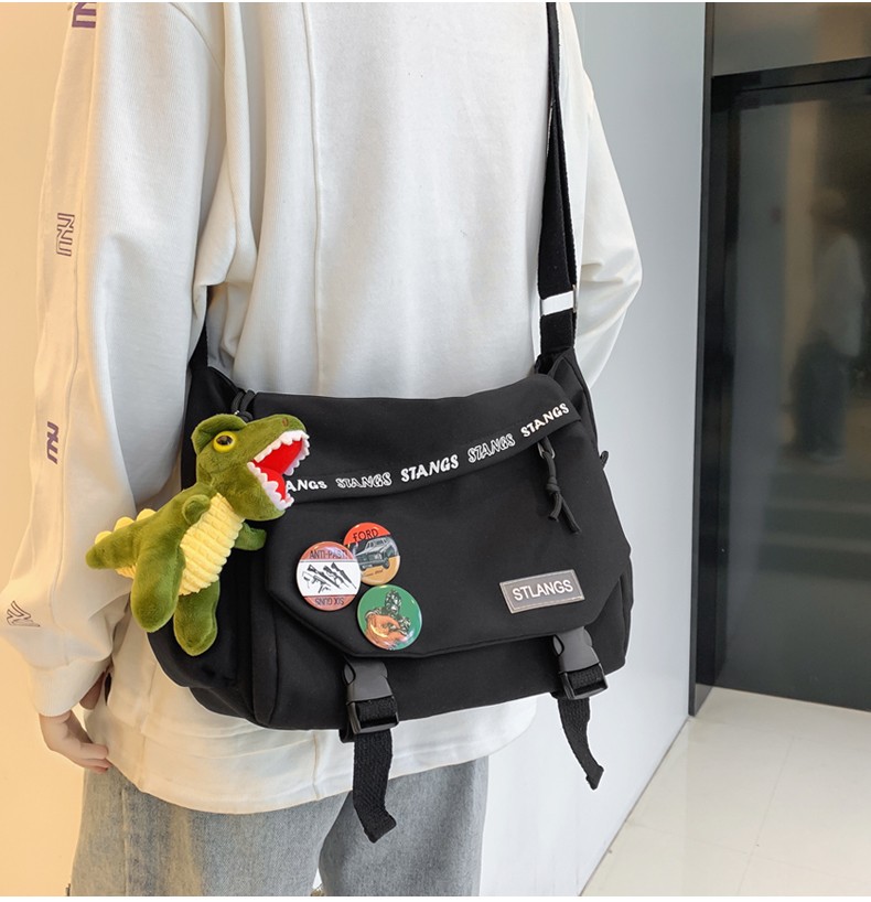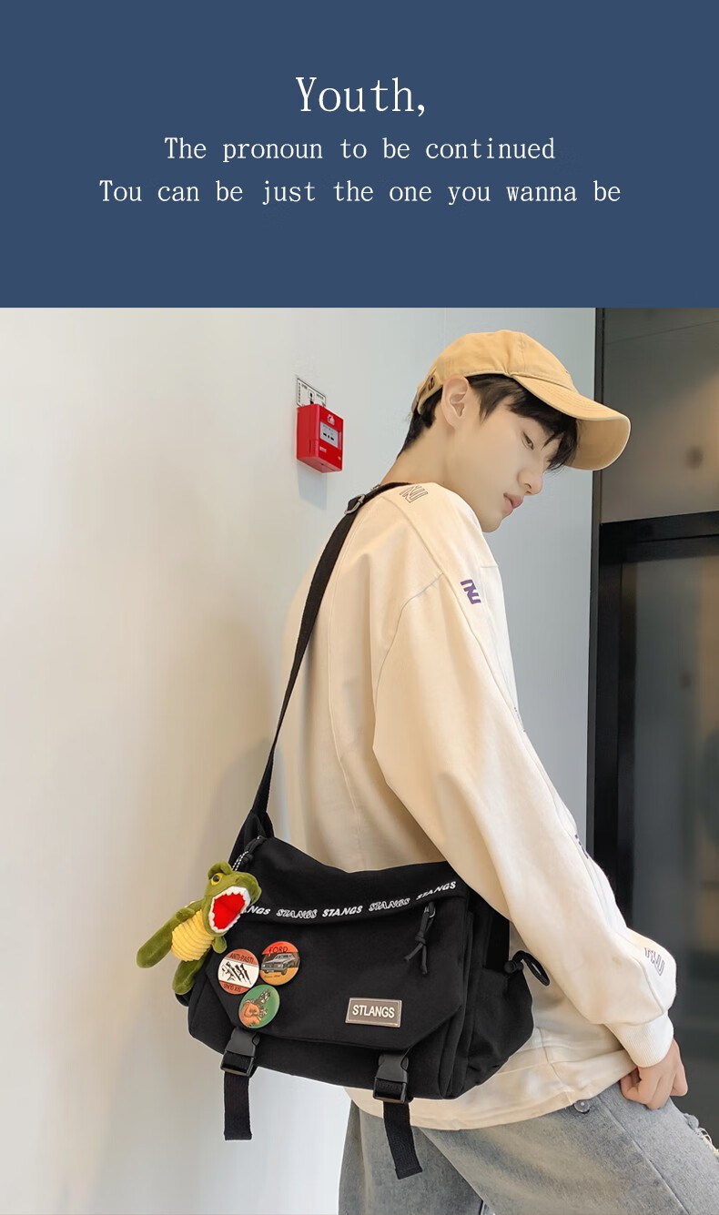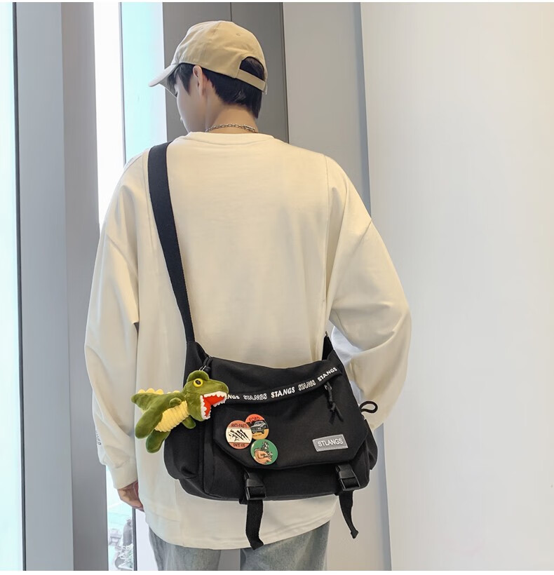 北慕 斜挎包男士潮牌学生休闲百搭潮大容量ins男生背包女邮差包单肩包 蓝色【红嘴恐龙+3个徽章】