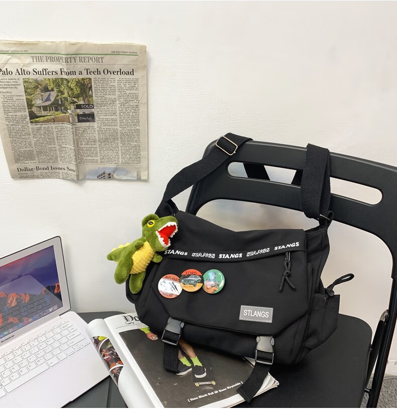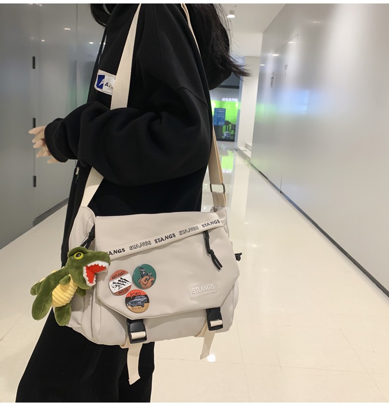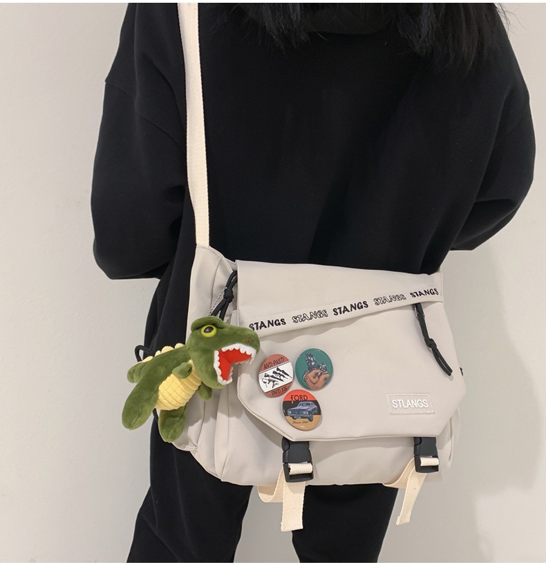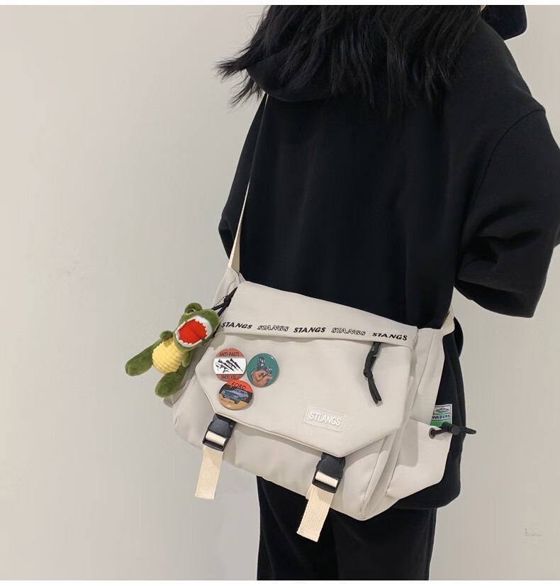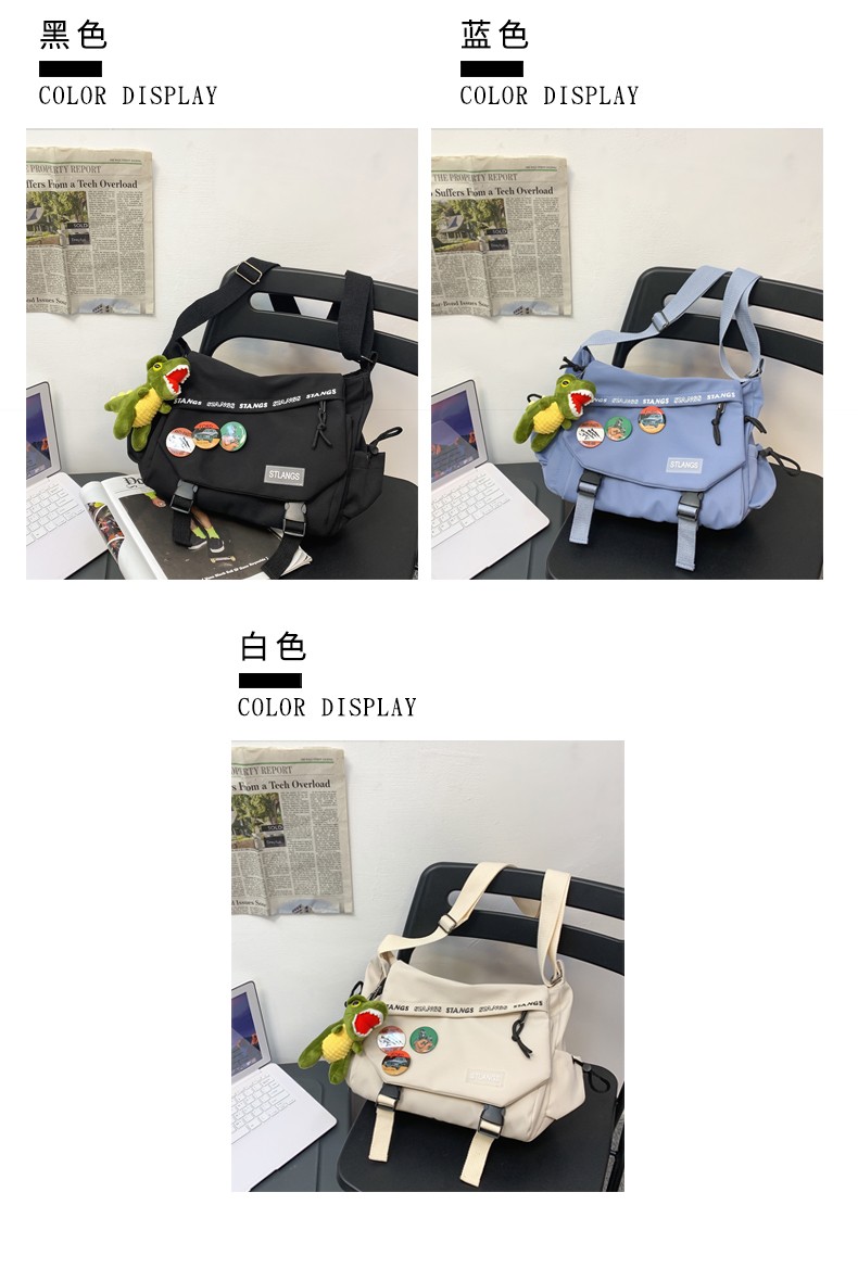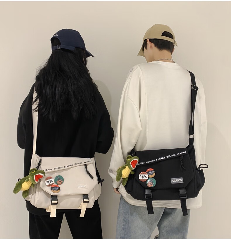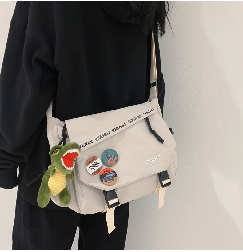 北慕 斜挎包男士潮牌学生休闲百搭潮大容量ins男生背包女邮差包单肩包 蓝色【红嘴恐龙+3个徽章】
